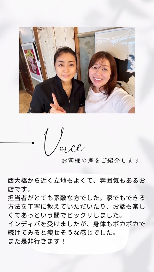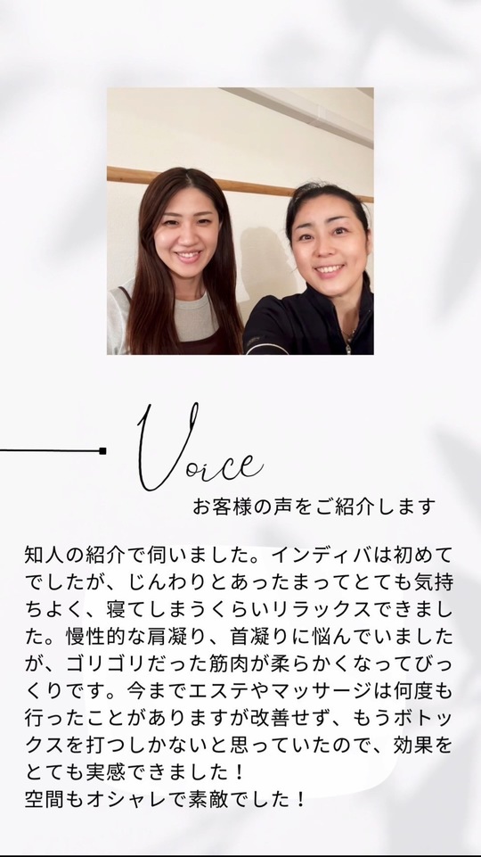 インディバを受けた直後など自分でも簡単にマッサージやストレッチなどが出来るようになりました。