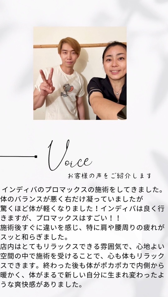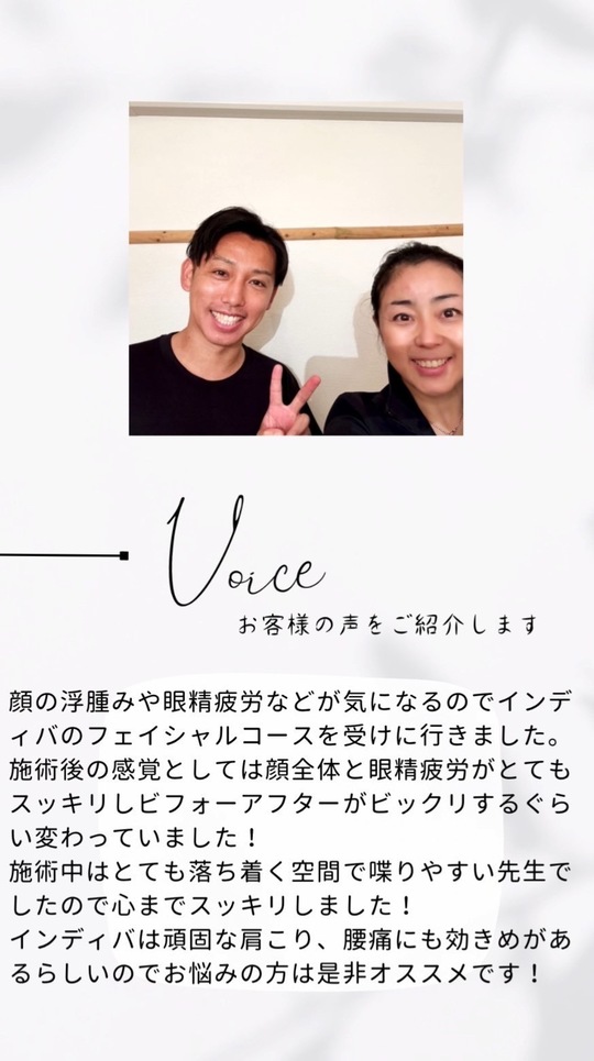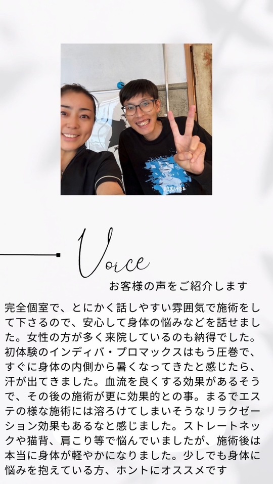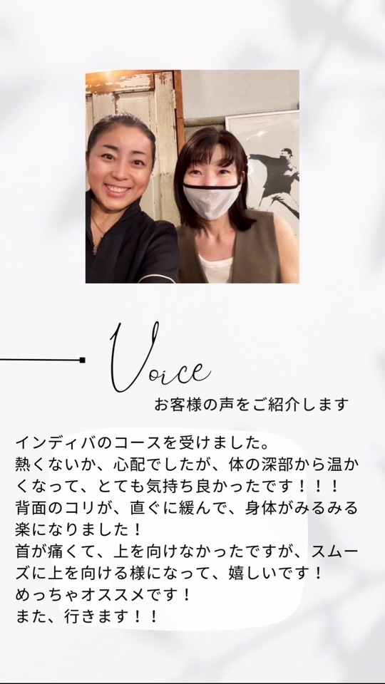 また、鍼とインディバを同時にしているので、施術した後にダルさや揉み返しなどが出るかと思いましたが、全くなく、逆に温かさが温存して調子が良い状態をキープ出来ています。