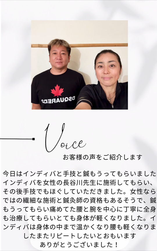 インディバと鍼の組み合わせで、翌朝も腰が楽で、起き上がるときに痛くなかったと喜んで頂き嬉しいです。