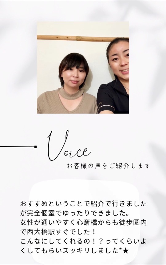 施術中から’ほぐれている’という感覚があり、終わった時には’背中に乗っていたものが1つなくなった!?’と思うくらい軽くなりました!!