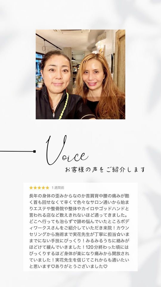 腰痛改善で伺いましたが、腰だけでなく全身のバランスを整えてもらえて大満足です!